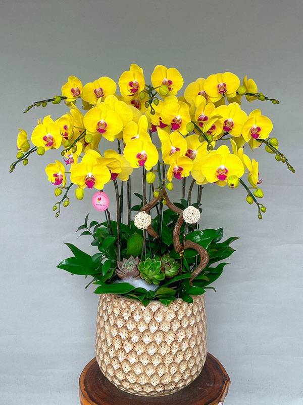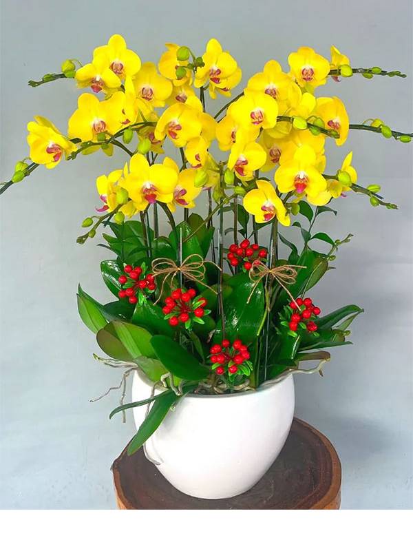 Màu sắc chủ đạo của chậu lan hồ điệp thường là màu vàng, là sắc màu biểu tượng cho sự giàu có, may mắn và thành công. Màu vàng của lan hồ điệp mang lại cảm giác ấm áp và rực rỡ, là điểm nhấn tinh tế cho không gian.